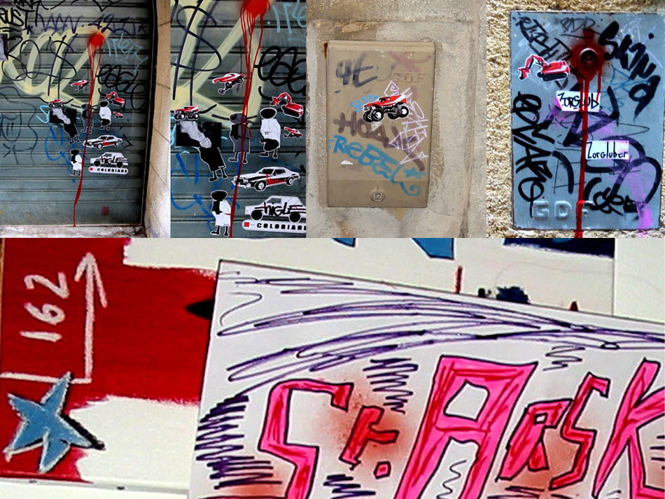 car, the Pope’s car, firemen trucks) stuck on sign posts. I liked the way they