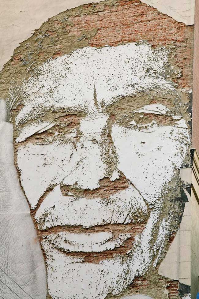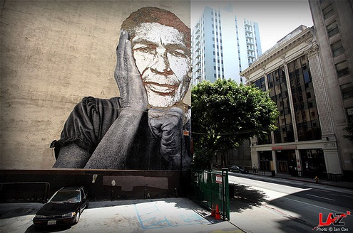The other day we posted a photo of a huge JR wheatpaste in Los Angeles What we didn’t know at the time was that the piece was actually going to be a collaboration with Vhils. The photos above show the finished work.